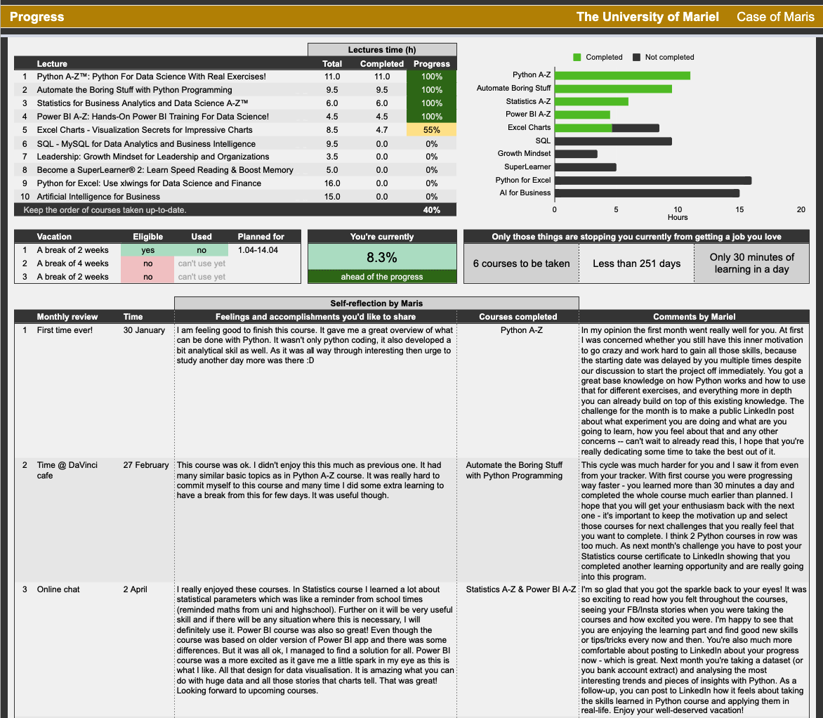 In case you don’t know me then I’m a big fan of automated spreadsheets in Excel and Google Sheets — and of course, I had to build a well-looking dashboard interface that functions as a feedback system on the progress she is making, time estimation, self-reflection area with the comments section. Any such program on that scale is hard and comes with its ups and downs. Writing down the positive feelings from the course helps her to keep on going at times when it’s not as easy. Mapping down the negative thoughts makes it understandable for even herself that this is only a temporary feeling and can be overcome with time or extra work. All that she is doing is for herself, and seeing the progress through such a tracker helps her to stay consistent with learning — especially when visualising such small perks as how much she is ahead of the program just because she sometimes loses herself in learning and spends an hour or two on that instead of learning only 30 minutes.